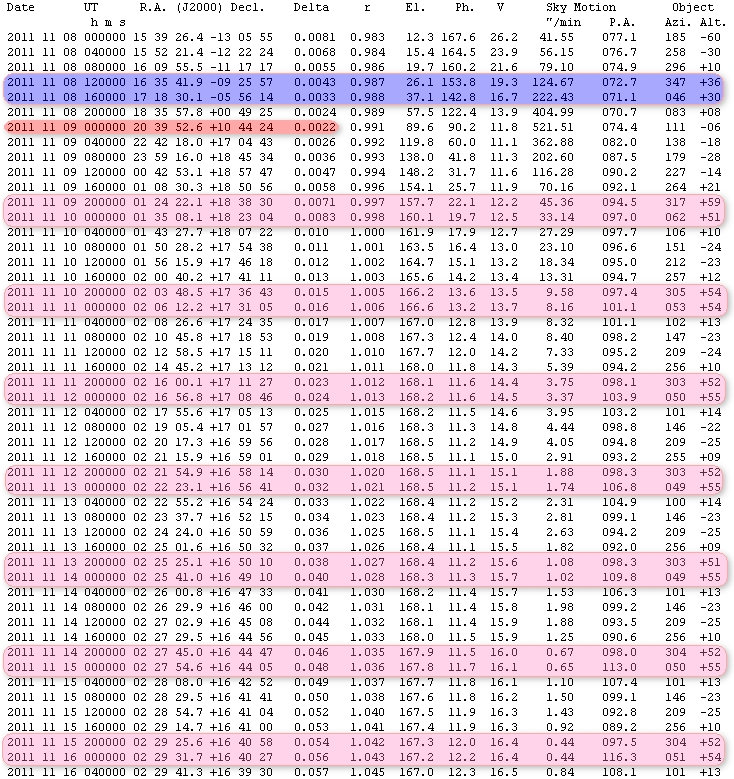 L'elevato moto proprio del giorno 8/11/11 (da 124 fino a 440 "/min ) renderà particolarmente difficile l'osservazione, la prima sera in cui l'oggetto sara visibile.