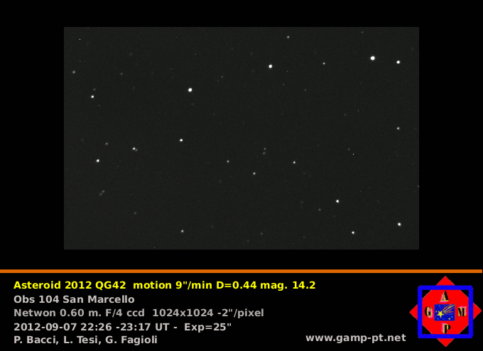 La notte del 07 settembre ò'atseroide è stato osservato dall' osservatorio di San Marcello, di seguito l'animazione del passaggio ravvicinato alla Terra, quanto aveva un mag di circa 14.2 con un motion di 9"/min. è una distanza di 0.044 UA. Il giorno 14 settembre raggiungerà la massima vicinanza alla Tera a circa 0.020 UA (300.000 km circa 7 volte la distanza terra- Luna).